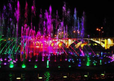 Really cool water fountains at night with all the colors of the rainbow and then some.